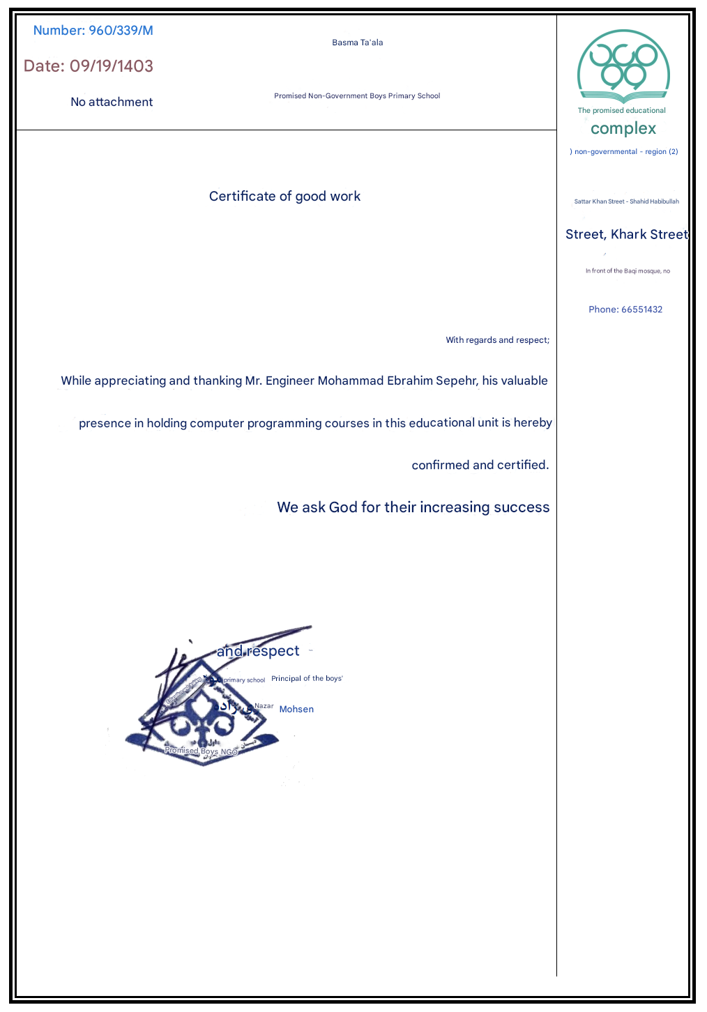 Delivered workshops at the University of Isfahan for graphic design students and mentored high school students at Moud High School, fostering enthusiasm and readiness for programming careers.